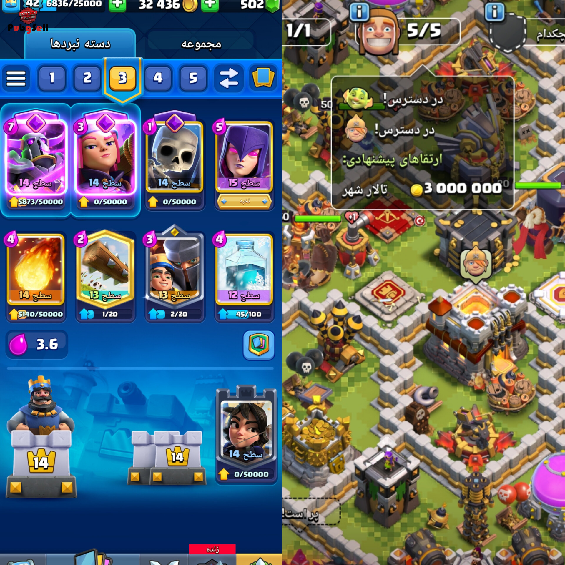 باسلام دو اکانت کلش آف کلنز و کلش رویال یک جیمیل هست رویال کارت زیر 11 نداره پر استیکر هست و کاپ 7000هزار اف کلنز لول 132 هست پنج کارگر 2300جم داره یازده فول مکس مانع فول چکش کتاب فول دوتا جلد بربر .یدونه کویین .دوتا هم واردن ارزان می زارم زود فروش بره