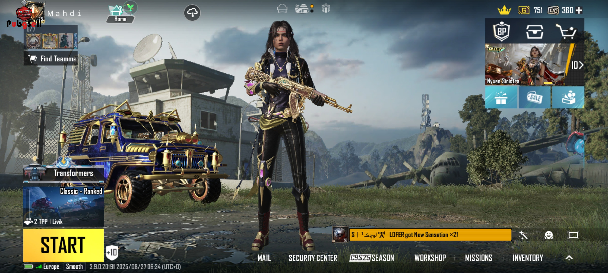 این اکانت دارای 7200 اچیومنت اسکین ها : 3 عدد التیمیت ( ماسک . کلاه و کیف) 91 عدد متیک . 22 عدد گان آپگریدی ( در ویدئو مشخص هست) لول کالکشن : 60 استارت شده از سیزن 16 لول هوم : 27 اسکین های آپگریدی Marine Evolution - UMP45 (Lv. Max) Codebreaker - AKM (Lv. 5) Titanium Shark - Kar98K (Lv. 2) SCAR-L (Lv. 2) Forest Raider - GROZA (Lv. 1) 8-Bit Blast - UMP45 (Lv. 1) Drakonbane Remnant - Machete (Lv. 1) Circus of Screams - Crossbow (Lv. 1) Bunny Munchkin - AKM (Lv. 1) Panthera Prime - DBS (Lv. 1) Faerie Luster - Pan (Lv. 2) Lilac Finesse - Thompson SMG (Lv. 1) Nightscape Gladiator - PP-19 Bizon (Lv. 1) Seadream Melody - SLR (Lv. 1) Spirit Sentry - UZI (Lv. 1) Tundra Knight - Dagger (Lv. 1) Thornrose Dawn - M16A4 (Lv. 1) Patchmetal Bunny - Mk47 (Lv. 1) Rustborn Strider - NS2000 (Lv. 1) Chow Blaster - SCAR-L (Lv. 1) Nightscape Gladiator - PP-19 Bizon (Lv. 1)