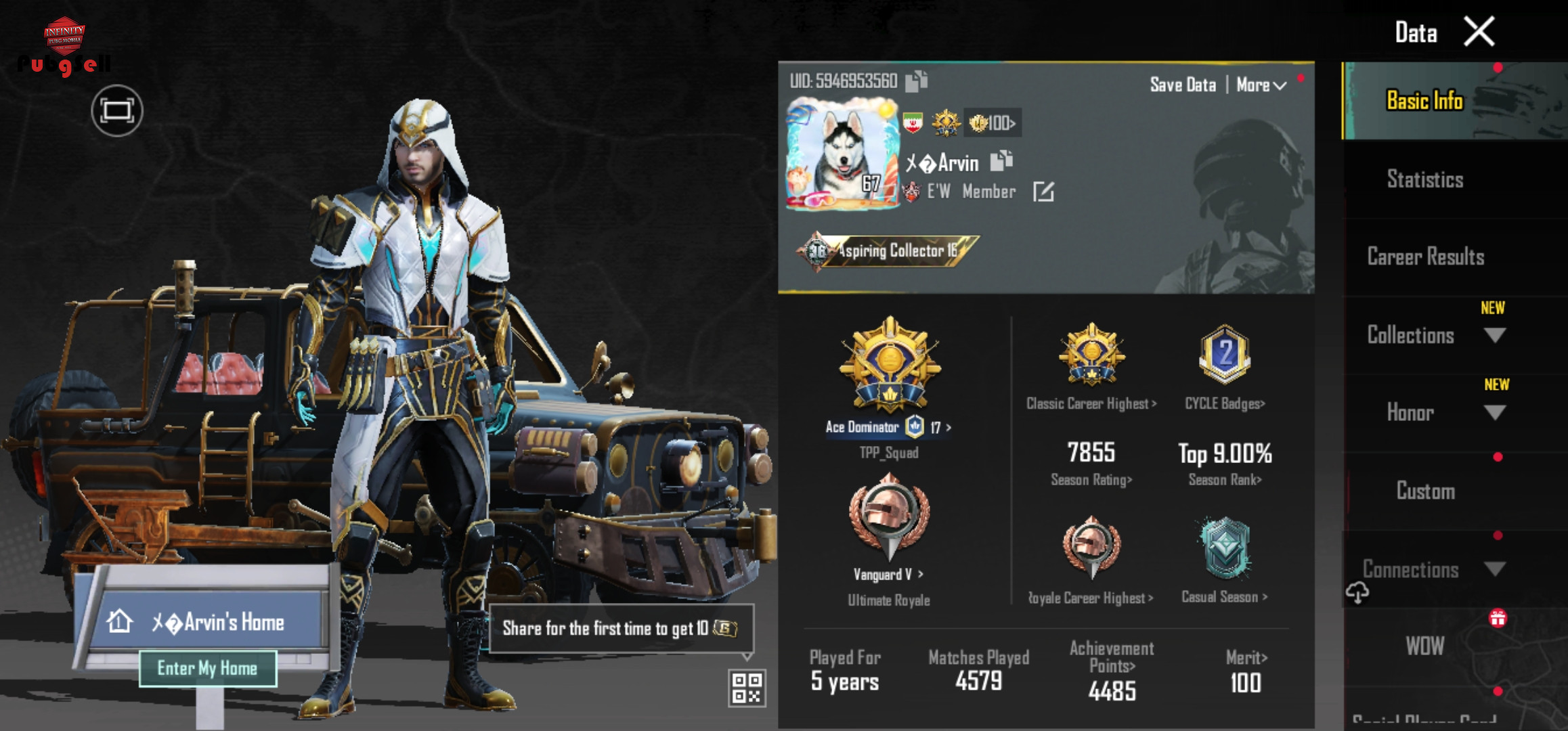 دارای کاراکتری Laith گان های ScarL صورتی مکس کیل مسیج گان UMP9 قرمز لول 1 گان شاتگان لول 1 نایف یا همون قمه لول 1 قایق هم لول 1 همه اینها با متریال میتونن کیل مسیج بشن 2 سیزن آخری مکس شده و سیزن های S18 و S19 مکس شده از سیزن 14 هم استارت خورده زیر قیمت گذاشته شده خود پابجی سل 2500 قیمت زده ولی پول لازمم