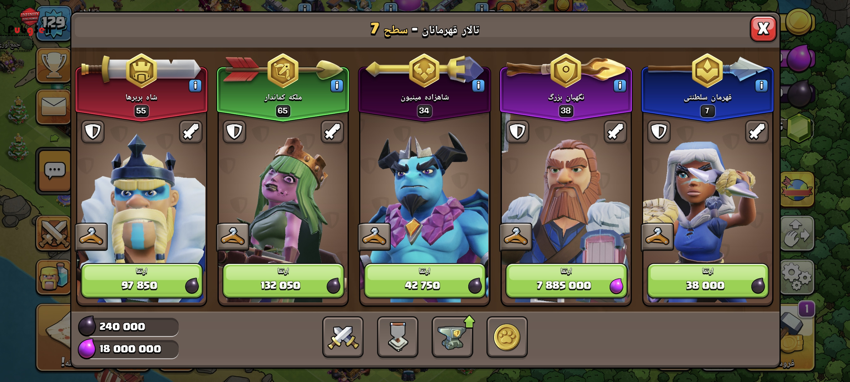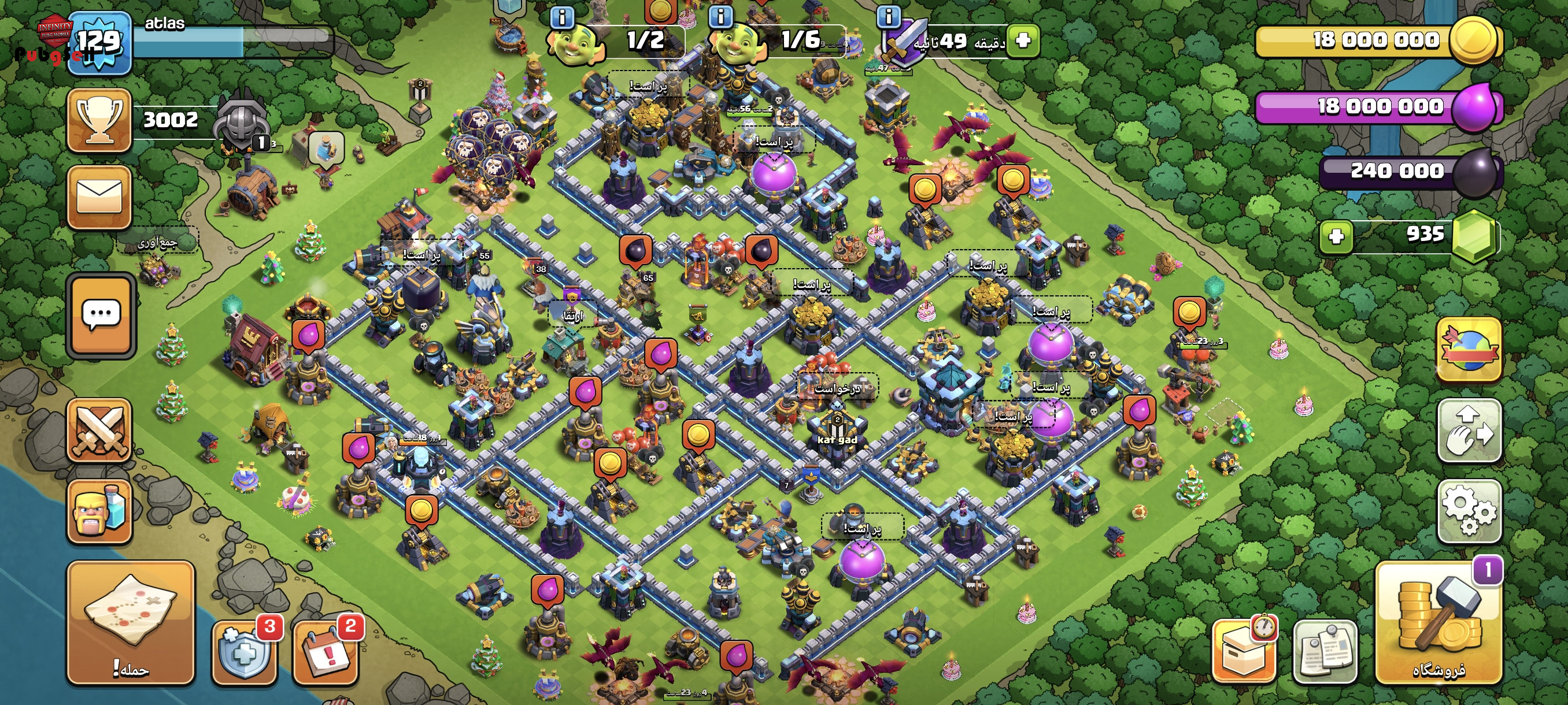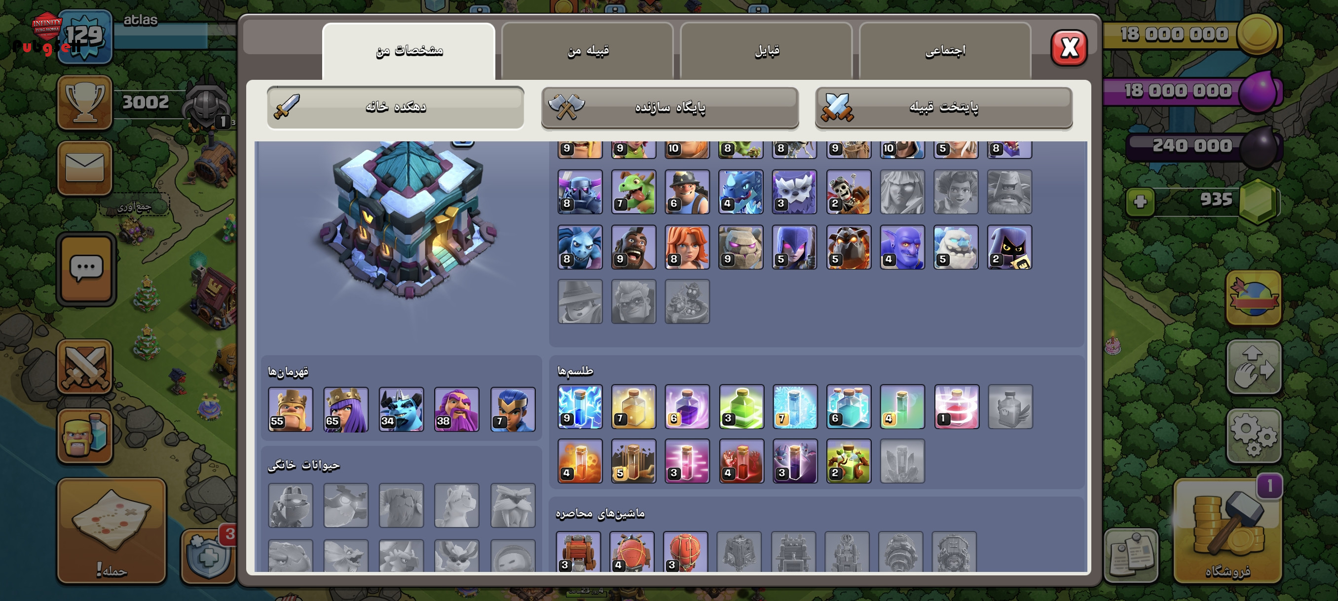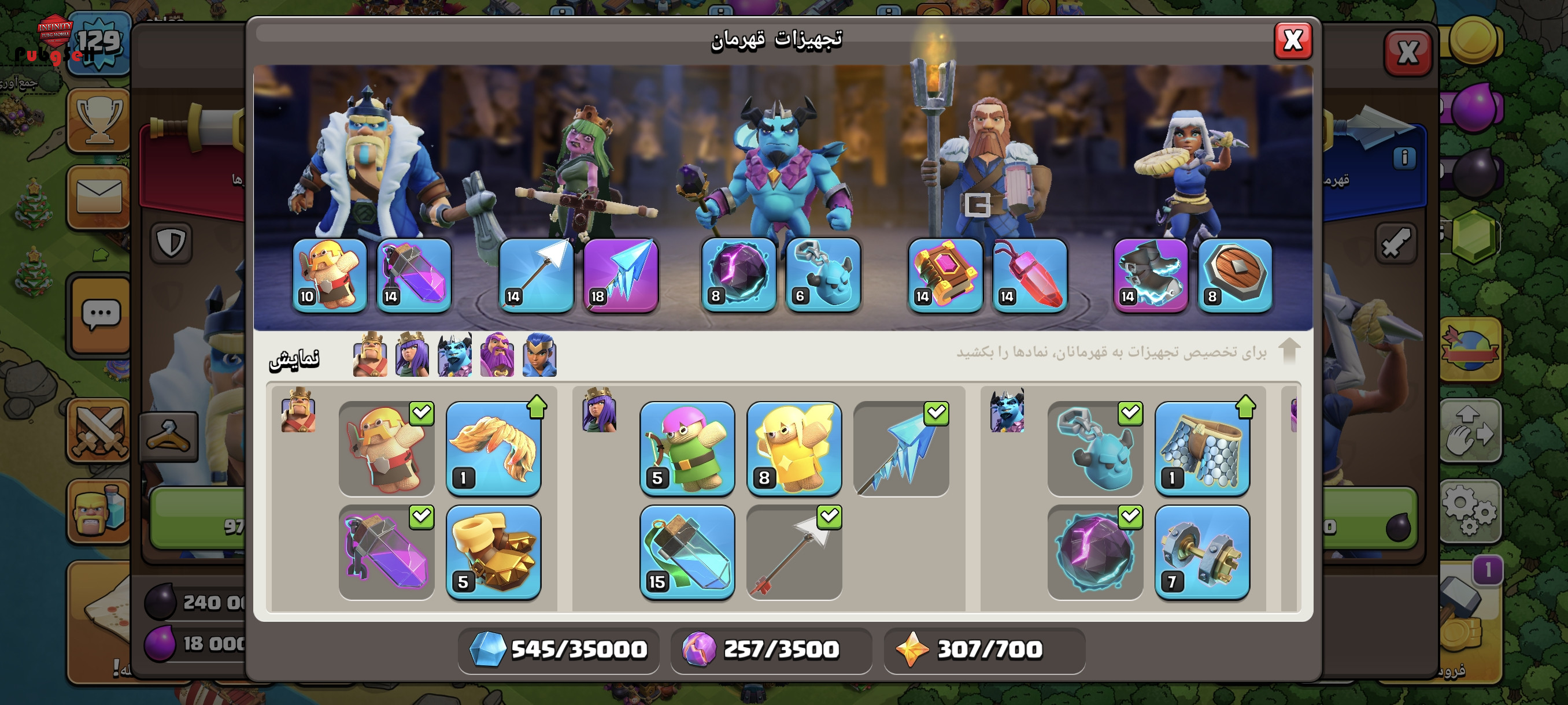 کلش تاون 13 کم مونده به مکس اماده لول دادن به 14 هستش 935تا جم داره 5عدد کارگر جلد بربر کویین واردن و رویال چمپیون اکانت همه نیرو ها مکس بجز 5تا اینا که استفاده نمیشن