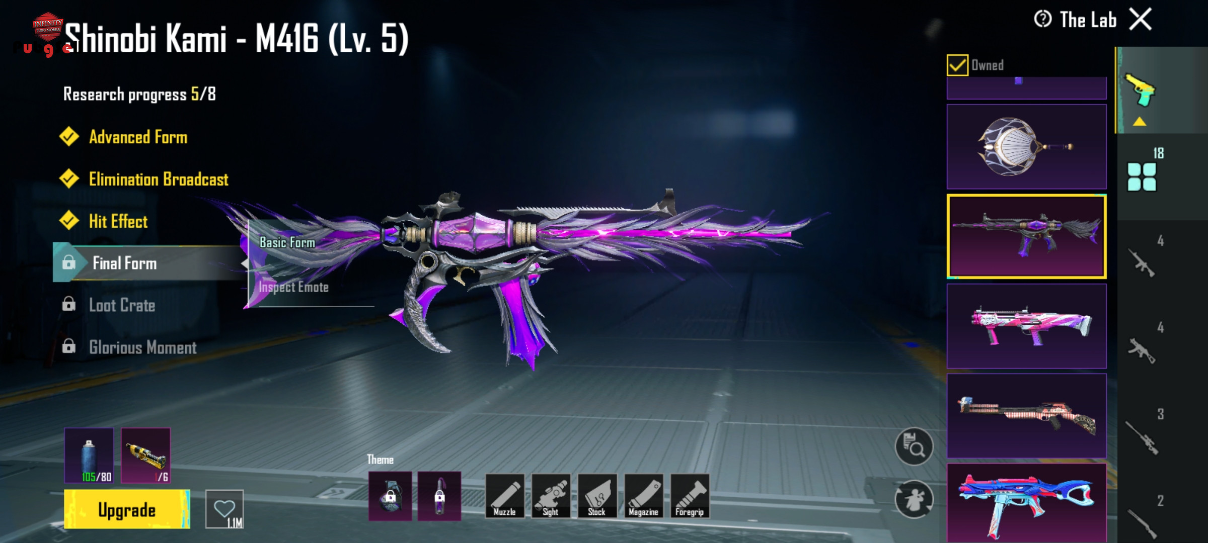میرسیم به بخش جذاب گان های آپگریدی که این اکانت 18 تا گان آپگریدی خفن داره که بهترینشون M4 بنفش لول پنج هست که یه ست التیمیت خفن داره جذاب تو تصویر و ویدئو مشخص هست