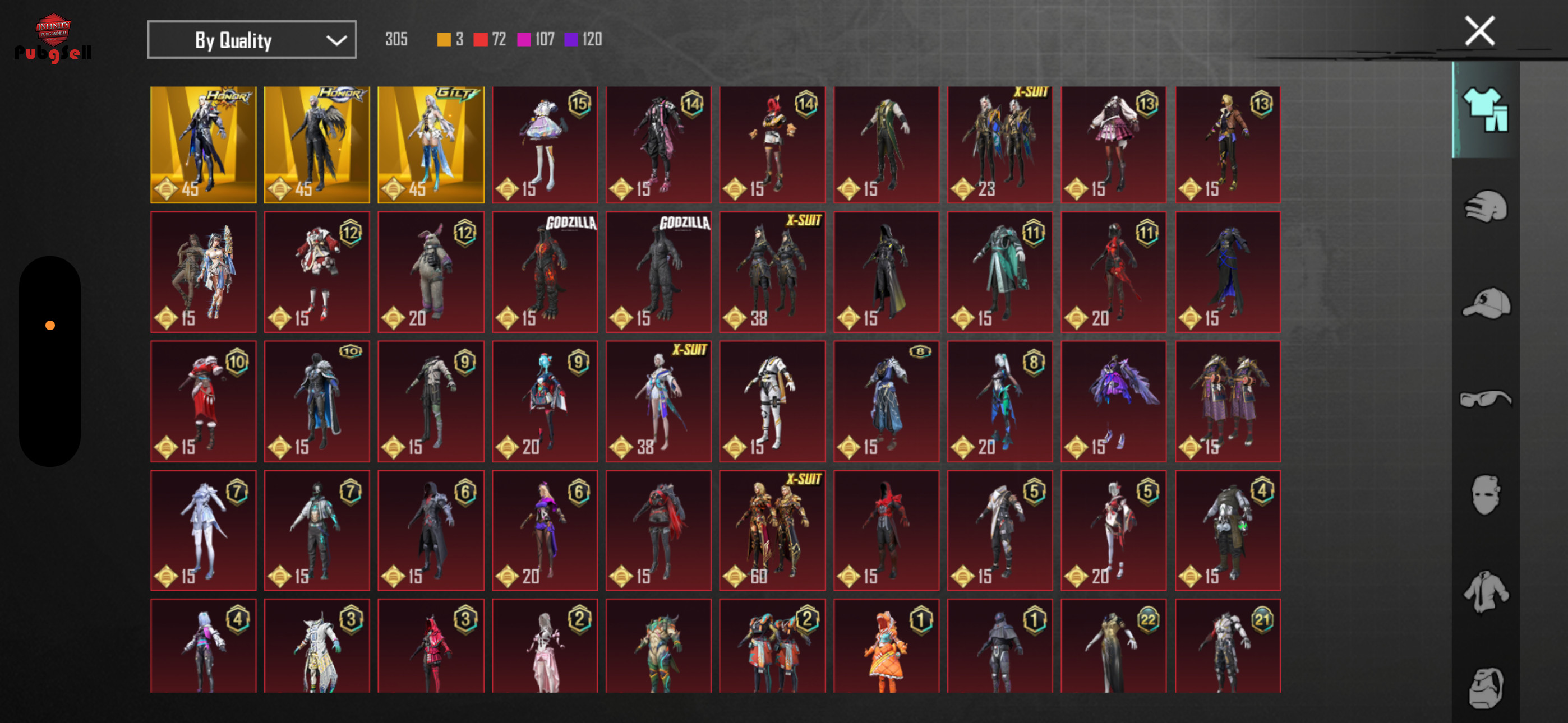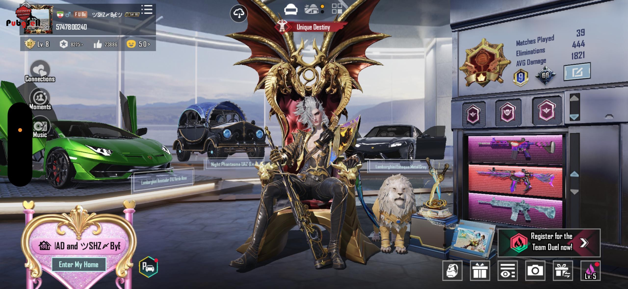 M4 shinobi lv 7 M4 glacier lv 6 M4 the fool lv 1 Ump void souleater lv 5 Akm lightshift temple lv5 M24 cadence maestro lv5 Amr scorching blessing lv4 Mg sky huntress lv4 Uzi glacier hammer lv4 Groza burning godzilq lv2 Awm valor’s requiem lv1 XSuit: 7 Ignis x-suit lv3 Galadria x-suit lv2 Anukhra x-suit lv2 Dravion x-suit Iridescence x-suit Golden pharaoh x-suit 11 متریال نقره ای کامل و 287 متریال گلد Gilts suit: The moon’s luminance set Temperance’s virtue set Winter highness set Super Cars: Lamborghini estoque Lamborghini aventador