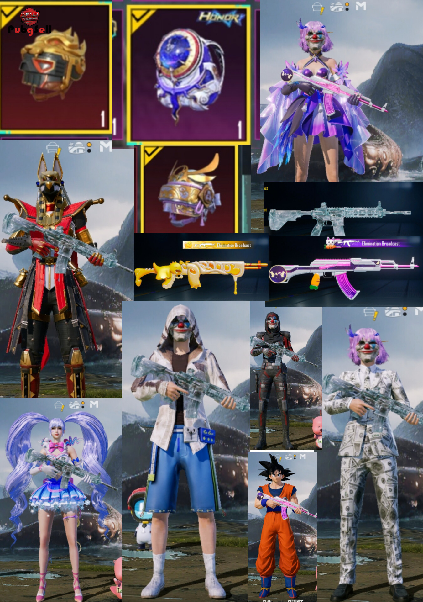 Glacier m4 lv5 M24 lv4 Uzi feron lv4 Akm bunny lv1 Ump rp max M762 unicorn lv1 Groza lv1 Pp19 lv1 Mg3 dragon lv1 Dp lv2 Kar98 lv max Aug lv1 Mk14 lv1 فول ست tdm خودی رنجر شلوار ست آلن واکر دو علامت مایک ست دراگون بال و گان اپگریدیش ست التیمیت و 129 باکس طلایی که هر گام اپگریدیش که خواستین میتونین بگیرین اکانت خوش شانسی است در حال حاظر سه تا متریال کامل دارد مدارای یک متریال اریکسون کوله پشتی التیمیت و ست های نایک غیر ارپی ست دلاری لابی متیک