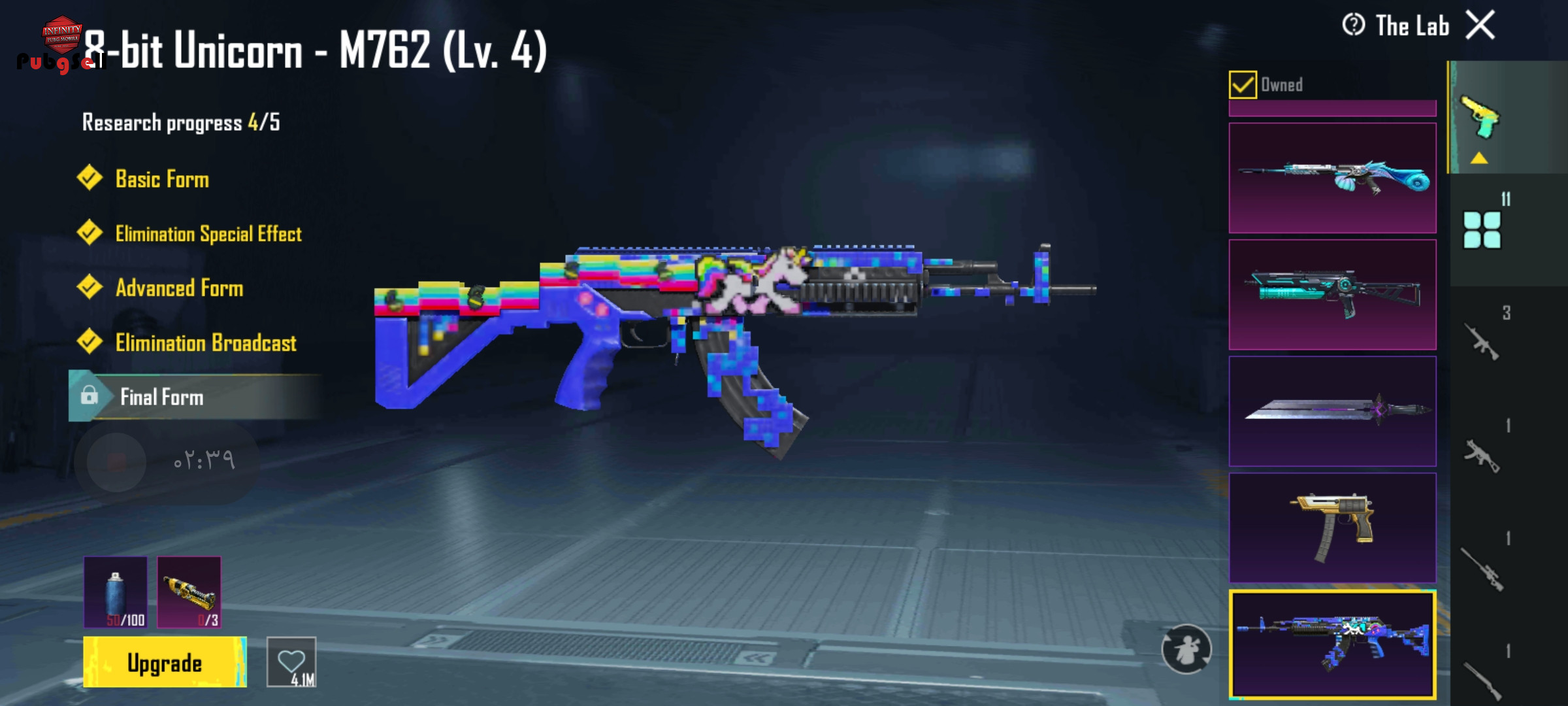 دارای 11 گان ابگریدی که 4 تاش مکسه، M700 لول 4 هست و 6 تای دیگه هم بعضیاشون لول 2 هستن، ماشین ابگریدی لول 1 هم داره و اینکه خلاصه بسیار اکانت خش شانسی هست