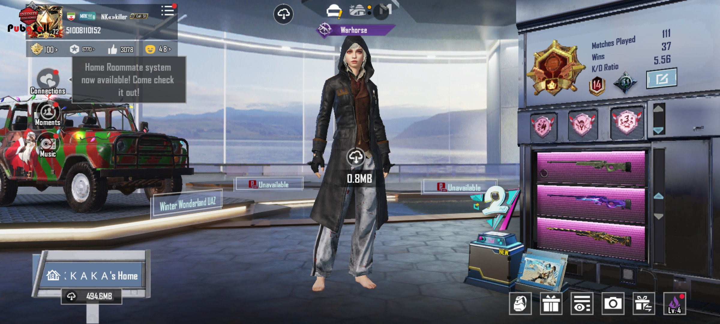 اکانت خوش شانسی هست اکثر ایتمای. ایکسوتو داره ای دبل با چندتا اتچمنت گلایدرش بک پک نیدو ملوتوف ست متیک دنساش قاب عکسش دنس سیزن 2 و کلی دنس باحال داره 16 گان اپگرید داره که گان کلوزاش اکثرا کیل مسیجه کلی بک پک هلمت داره ماشین جیپ کریسمس داره M24الکتریکی. لول سه هم داره که سیزن بعد میتونین کیل مسیجش کنین یه دونه متریال داره. با 8 تیکه مین مت 70 تا جعبه طلایی داره 360 تاهم یوسی داره که قیمتشو مفت گذاشتم