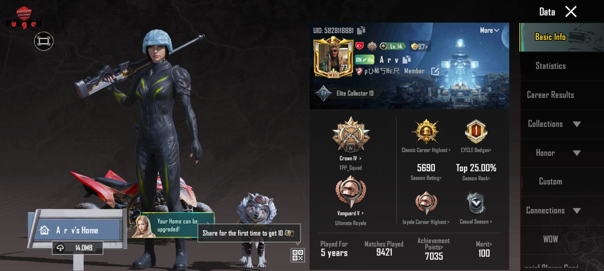 کالشکن وسط. 59 85 عدد متیک 19 عدد گان اپگریدی از سیزن m1 تا الان فقط 5 سیزن الایت نیست تا آخر سیزن هم 350 یوسی داره هلمت یخی داره پت گرگ رو با اسکین داره ست متیک فورج داره Scarl rp lv2 Thampson rp lv2 Dbs rp lv3 kill Groza lv1 Ump rp lv3 kill Awm lv1 M259 queen lv4 kill Uzi pharon lv3 M700 unicorn lv3 M24 seas lv4 kill کلی دنس باحال داره که بیشتر از 100 تا هست