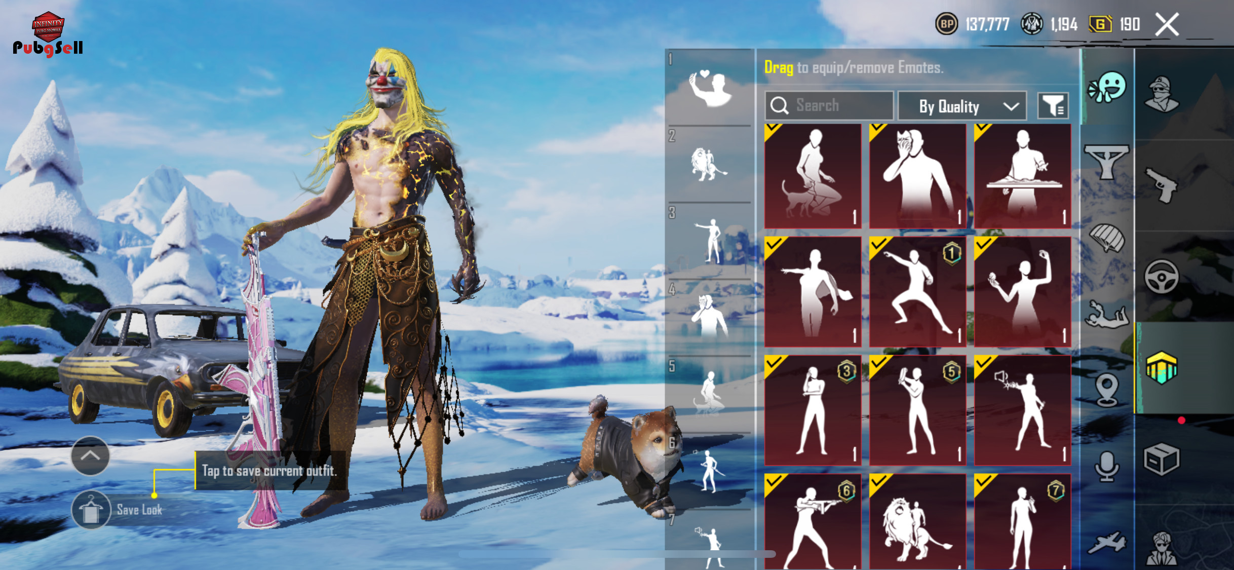 اکانت همه چی تموم هستش لباس ست مجستیک داره امفور یخی کیل مسیج ماسک جکر سیزن 2 داره دنس های خفن داره دارای 14 گان آپگریدی دارای یک ماشین پیکان طلایی آپگریدی
