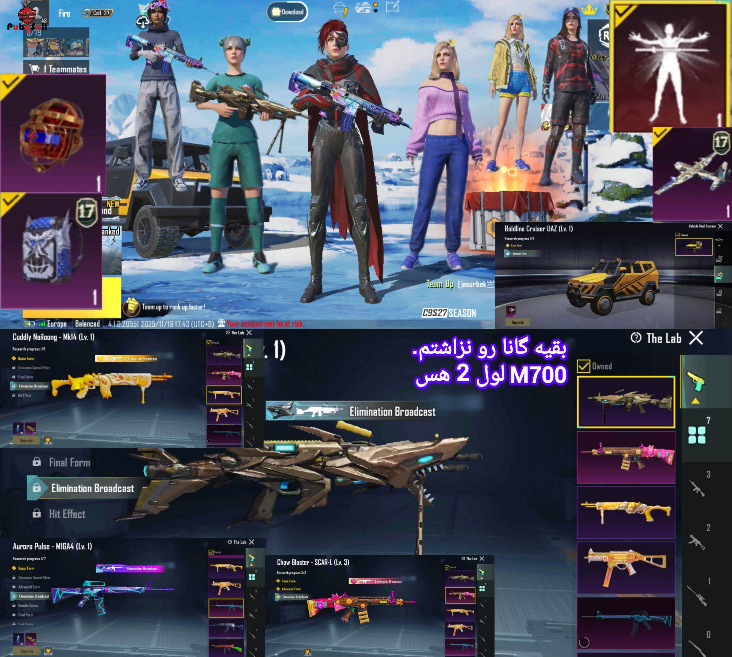 به نام خدا 7 گان ابگریدی که 6 تاش غیر آرپی هست دارای ماشین ابگریدی و کلی ست تی دی امی خفن اکانت بسیار خش شانس و امکان گرفتن امفور یخی زیاده.
