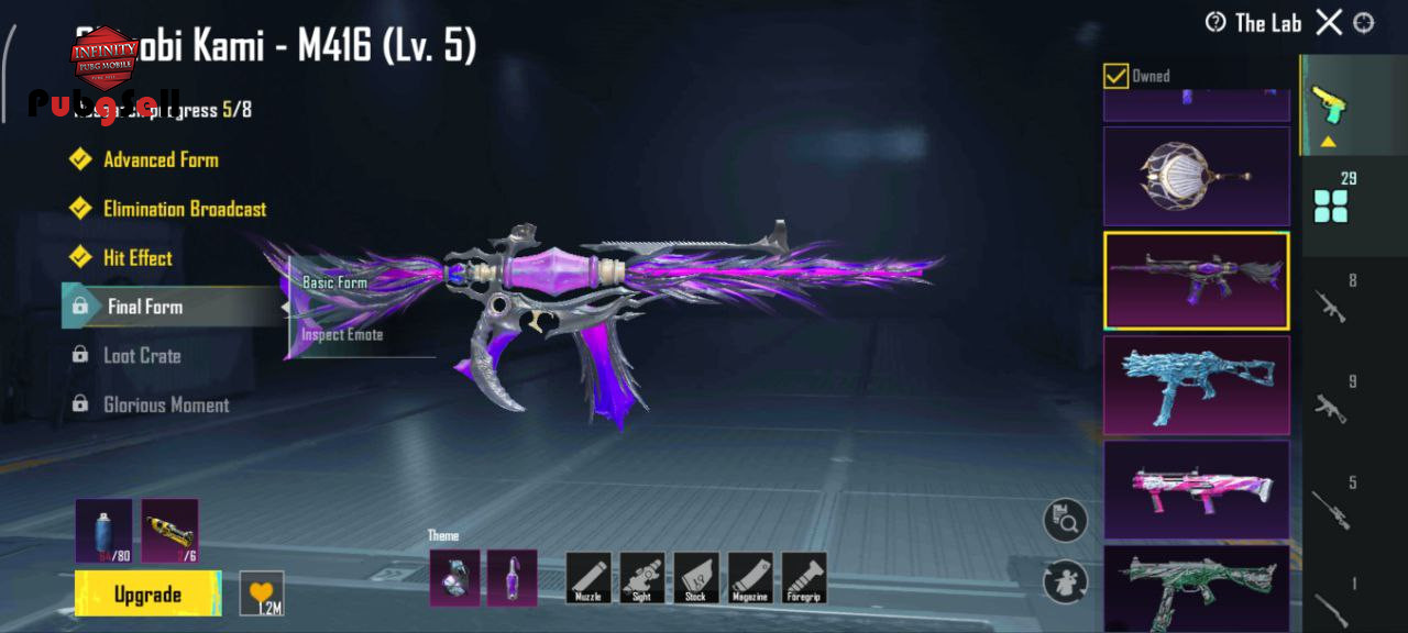 M4 level 5 AKM level 4 AWM level 2 M762 level 4 M762 level 1 Mini 14 level 1 pp19 level 1 AKM level 1 mg3 level 1 groza level 3 UMP ice level 4 UMP level 1 AMR level 1 Uzi level 4 3 عدد ست اپگریتی پوسایدون لول 1 لباس گیاه لول 2 لباس سفید پادشاه جنگل لول 1 ست های متیک فورج