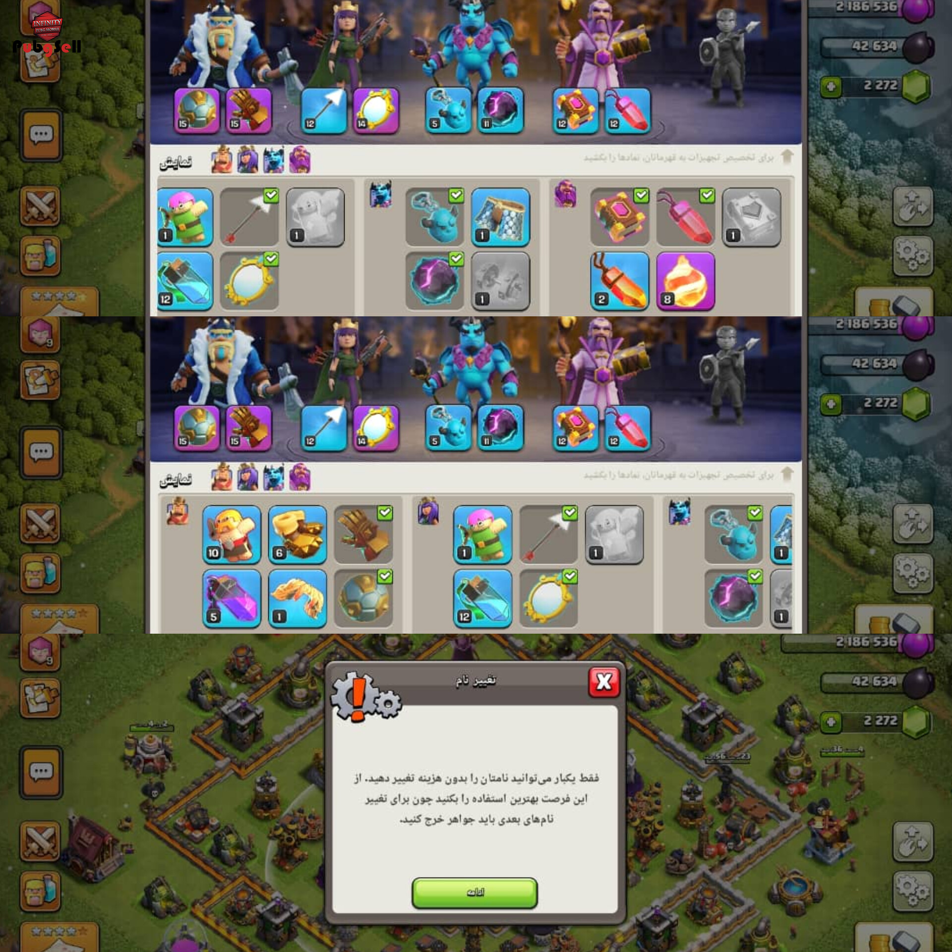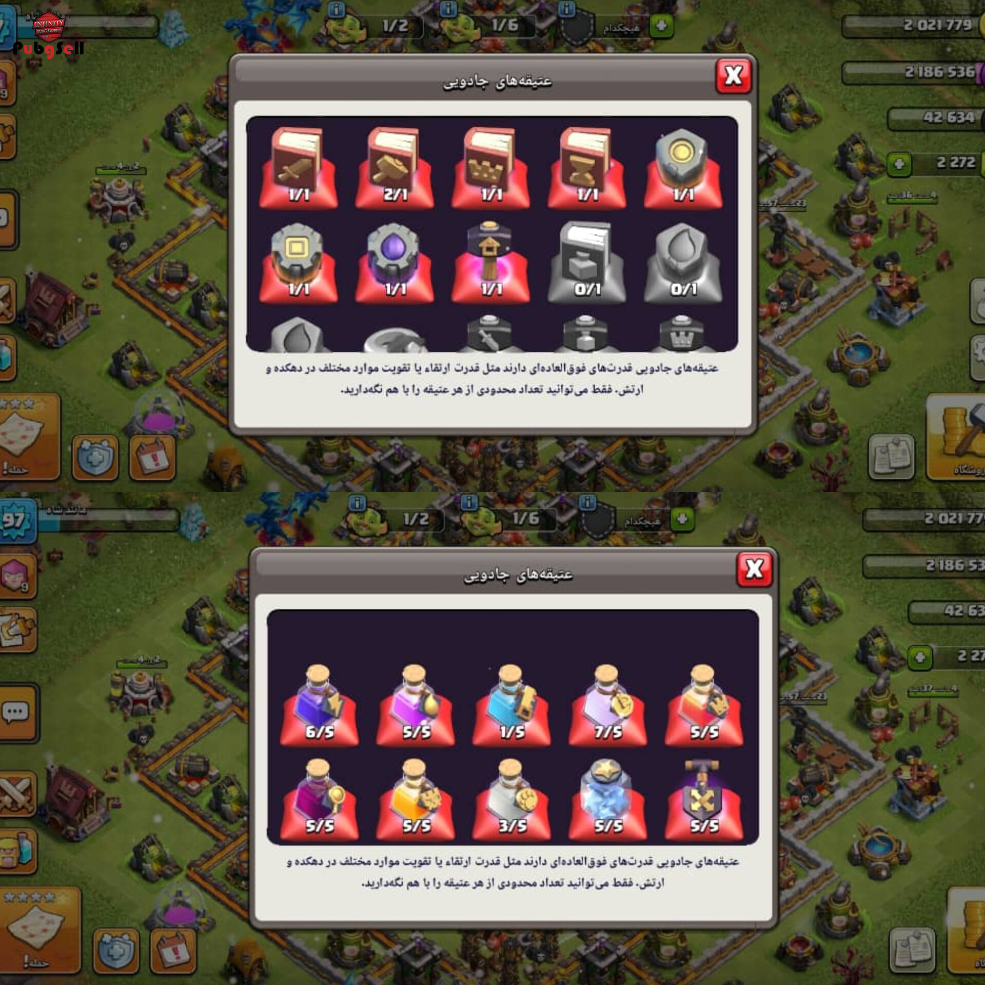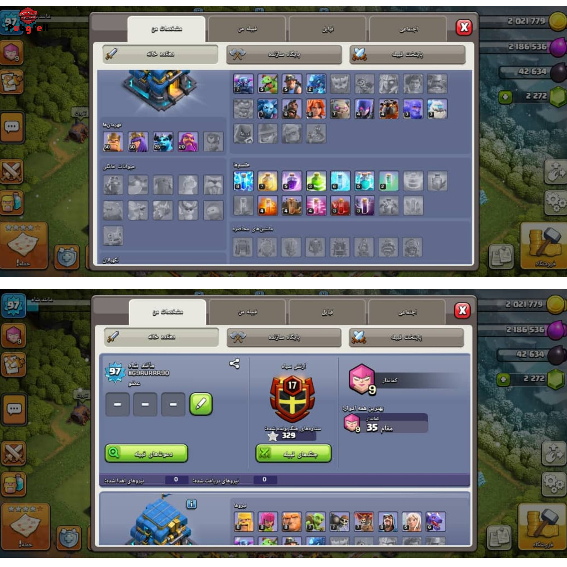 تان 11 مکسه رفته 12.کلی آیتم داره و کتاب های گرون.2272 تا جم داره و 657 تا مدال جنگ های قبیله ای