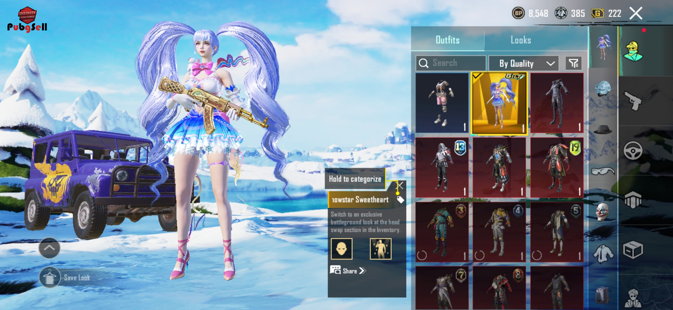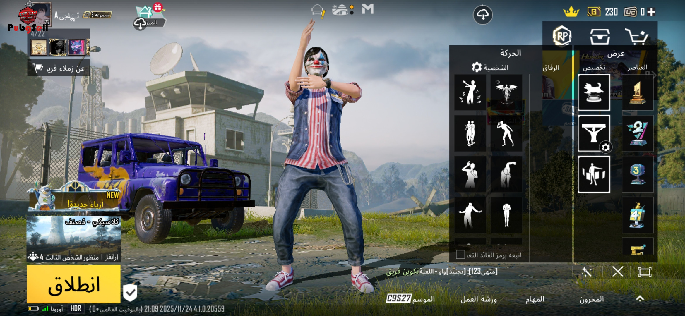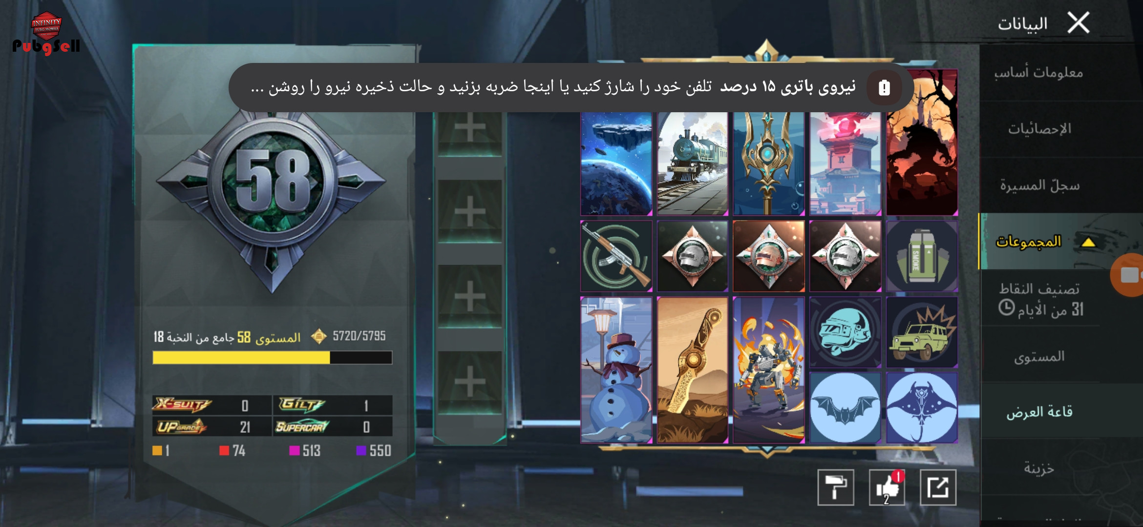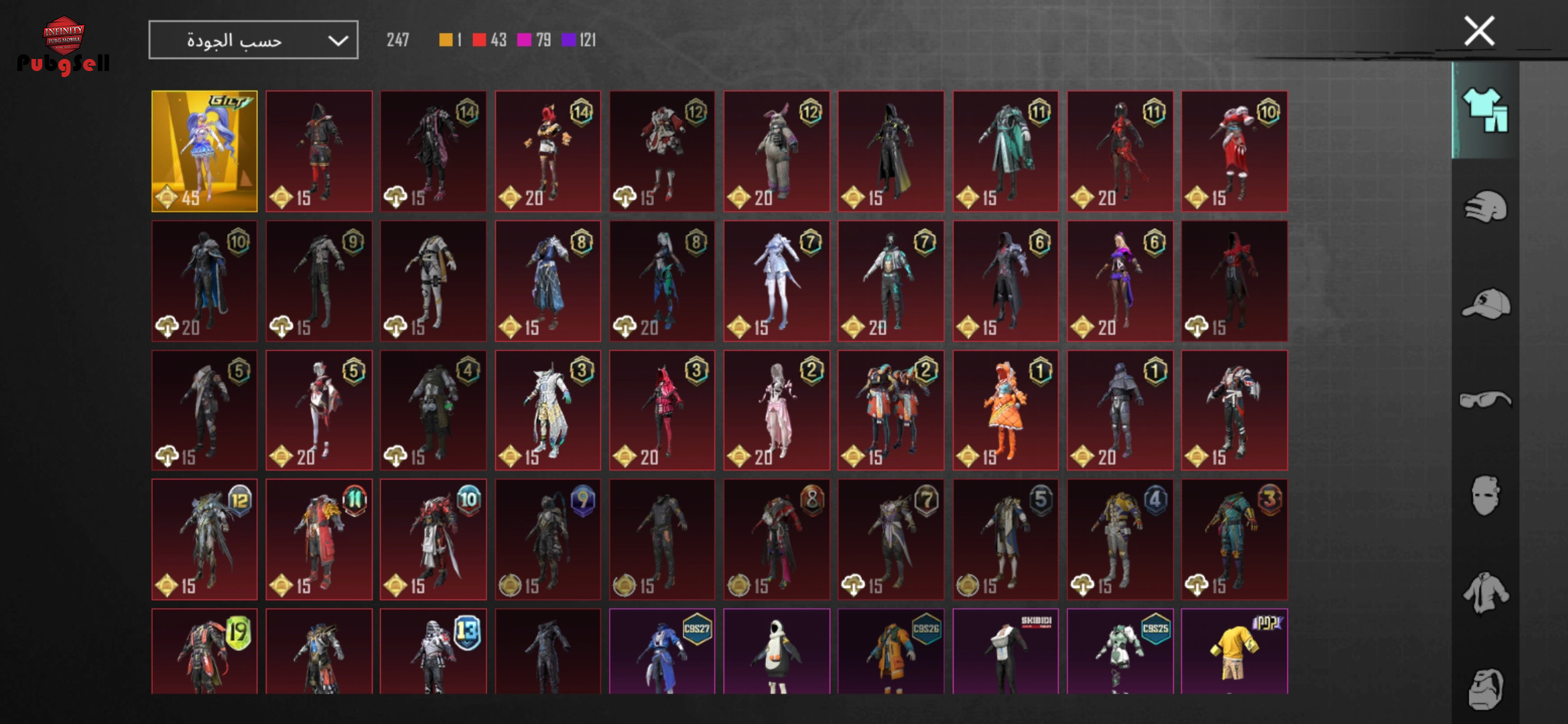 اکانت خیلی خفنه دارای 21 گان اپگریدی Chow Blaster - SCAR-L (Lv. 3) Valor's Requiem - AWM (Lv. 1 Patchmetal Bunny - Mk47 (Lv. 1) Thornrose Dawn - M16A4 (Lv. 1 Tundra Knight Dagger (Lv. 2) Spirit Sentry - UZI (Lv. 2) Seadream Melody - SLR (Lv. 1) Nightscape Gladiator - PP-19 Bizon (Lv. 3) Lilac Finesse - Thompson SMG (Lv. 1) Faerie Luster - Pan (Lv. 1) Panthera Prime - DBS (Lv. 2) Chicken Hot - Pan (Lv. 1) Circus of Screams - Crossbow (Lv. 1) Marine Evolution - UMP45 (Lv. 3) Drakonbane Remnant - Machete (Lv. 1) Soaring Dragon - MG3 (Lv. 1) Codebreaker - AKM (Lv. 3) Icicle - Minil4 (Lv. 1) (bit Unicorn - M762 (Lv. 4 Forest Raider - GROZA (Lv. 1) The Seven Seas - M24 (Lv. 4) و دارای یه لباس التیمت بسیار زیبا یعنی هر چی بخوای این اکانت داره دارای دو عدد ماشین های اپگریدی مثل داسیا و چیب قدیمی