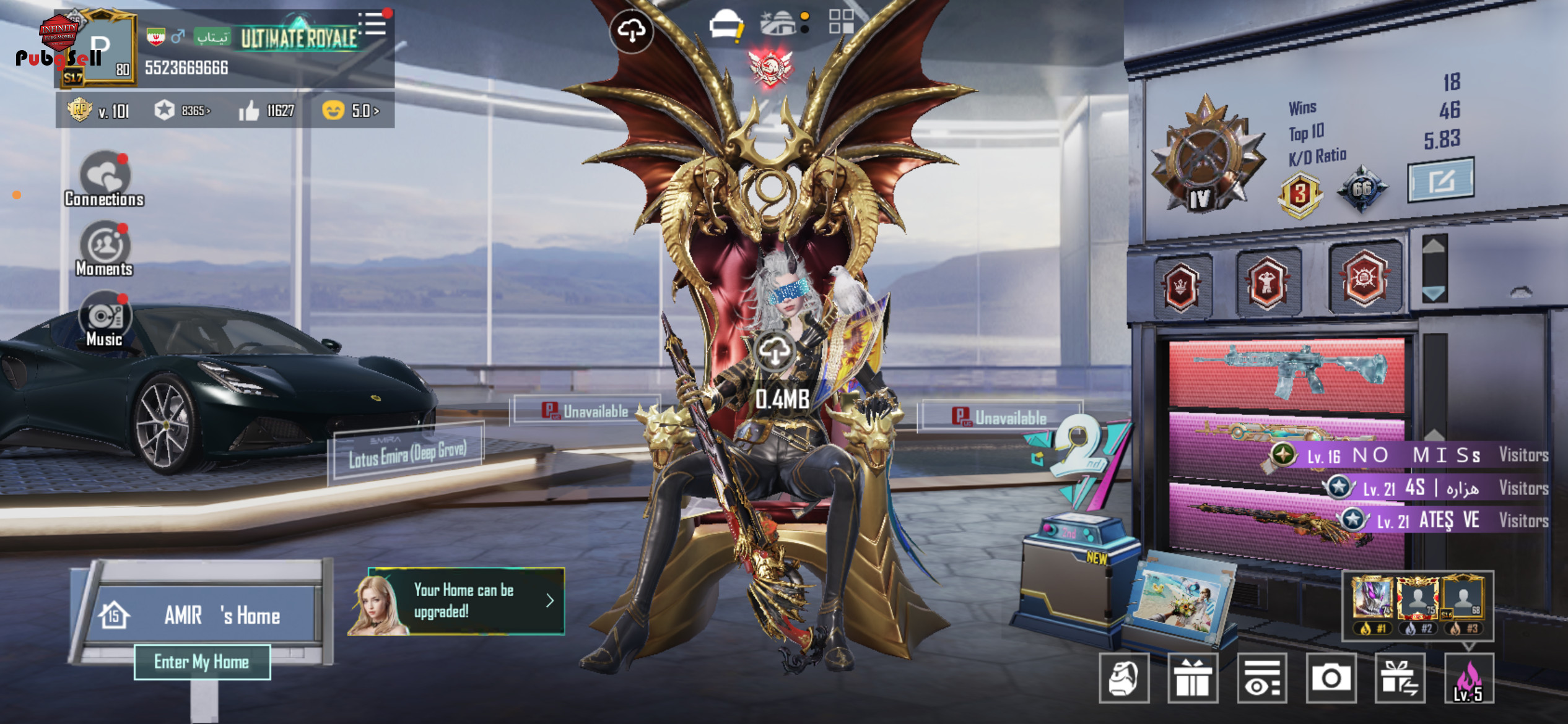 گانها: 1- امفور یخی مکس 2- یوزی رمانتیک کیل مسیج 3- ویکتور طلایی غیر ارپی کیل مسیج 4- ای کی ام تایگر کیل مسیج 5- ای دبل لباس اپگریدی کیل مسیج 6- ام هفتصد استار کیل مسیج 7- اف هفتصد یونیکورن1 تامپسون ای بیستو چهار شاتگان و کلی گان دیگه که هم برای ازپی هم برای غیر ارپی لول 1و2 تعداد گان های لول 1و2 (21گان) ماشینها: 1- ماشین کوپه لوتوس 2- ماشین پیکان بنفش آپگریدی ( کیل مسیج ) 3- ماشین جیپ اپگریدی لول یک لباسها: لباس آپگریدی لول 2 ست بانی متیک ست دازلینگ متیک ست نایت متیک هلمت متیک لباس اپگریدی مابقی آیتمها: 1- حدود سهکا یوسی 2- 19کا کارت ایجی 3- پنج متریال کامل + دو مینی متریال 4- پنج میتیک فورج کامل 5- 565 لاکیکوین 6- سه تا کارت ایدی 7- پرنده فالکون 8- 150 عدد جعبه طلایی 9- چهل کارت روم هفت روزه + شصت کارت روم یک روزه 10- تایتل لجند اولتیمیت