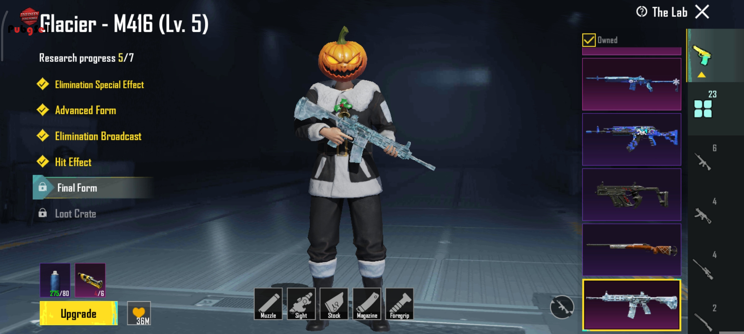 Glacier- M416 (Lv. 5) + 4 Material Chow Blaster- SCAR-L (Lv. 3) - kill Spirit Sentry - UZI (Lv. 3) - kill Drakonbane Remnant - Machete (Lv. 3) - kill 8-bit Unicorn - M762 (Lv. 3) The Seven Seas - MZ4 (Lv. 3) Soaring Dragon- MG3(Lv. 2) Panthera Prime - DBS (Lv. 2) Tundra Knight Dagger (Lv. 2) Thornrose Dawn- M1GA4 (Lv. 2) Concerto of Love- M7B2(Lv. 1) Blood Tooth- Vector(Lv.1) Icicle - Minil4 (Lv. 1) Golden Cipher - Skorpion (Lv.1) Faerie Luster - Pan (Lv.1) Lilac Finesse-Thompson SMG(Lv.1) Nightscape Gladiator- PP-19 Bizon (Lv. 1) Patchmetal Bunny - Mk47(Lv.1) Seadream Melody- SLR(Lv. 1) Rustborn Strider - NS200O(Lv.1) Candied Haunter - MP7(Lv.1) Winter Patrol - VSS (Lv. 1) Circus of Screams -Crossbow (Lv. 1)