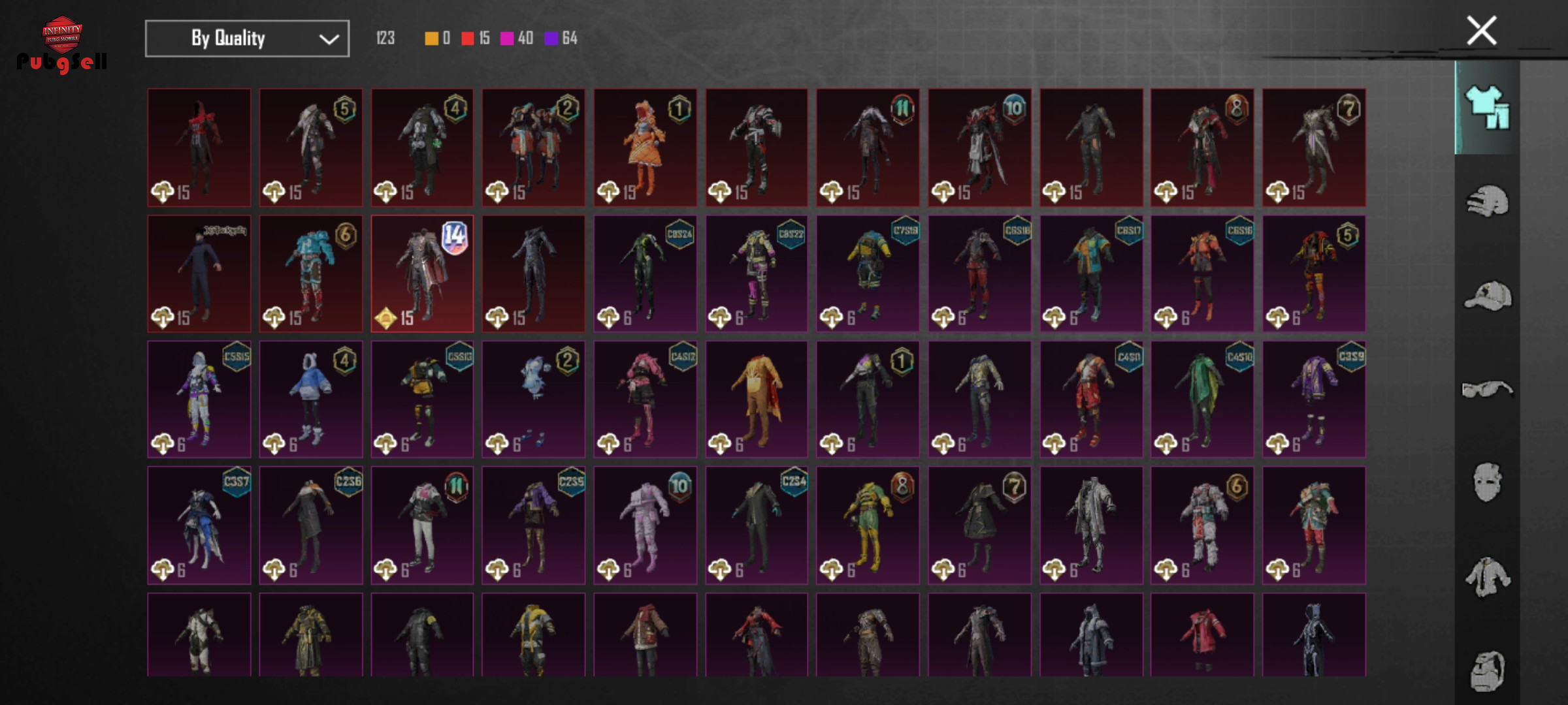 چندتا لباس متیک آرپی هلمت یخی کلاه پاندا و ماسک سیزن 2 و چندتا کلاه سیزن 3 یو ام پی آرپی دی بی اس آرپی پن و قمه آرپی شاتگان طلایی سیزن 2
